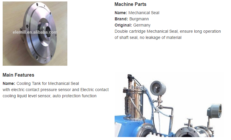 The rotor material: high wearing resistant steel/ceramic zirconia/silicon carbide/polyurethane, etc Chamber material: high wearing resistant steel/ceramic zirconia/silicon carbide/polyurethane , etc Sealing way: cartridge double mechanical seal, dedicated to bead mill, specially designed for materials with small granule .Whole unit, convenient to install and use, no need professionals to change it Discharging sieve specifications: large area of tubular reseau, 0.05/0.1/0.3/0.5 mm optional Instrument: electric contact pressure gauge & electric contact temperature gauge (with temperature protection, automatic stop over limit). Feeding pump: pneumatic diaphragm pump, screw pump or gear pump Grinding medium: pure zirconia beads with more than 95% zirconium content, beads size 0.1~1.0mm Electrical control system: explosion-proof/non explosion-proof configuration optional, with site operation panel (touch screen/frequency infinitely adjustable-speed optional)