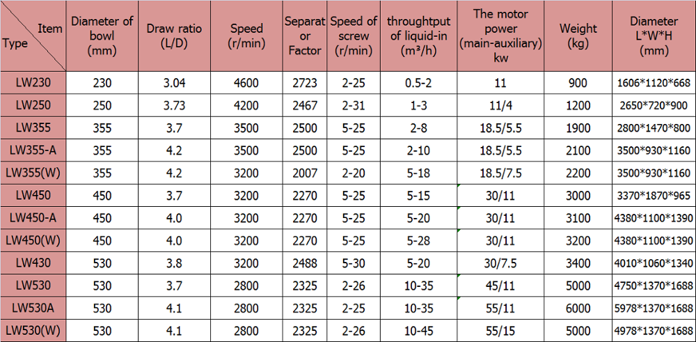 The centrifuges we produce can clarify, dehydrate or fractionate suspensions containing solid-phase particles in the 0.002-3 mm range. Products according to the structural characteristics of sub-LWB and flow, LW counter-flow, LWS three-phase classification of three types and series, can be adapted to different materials in different conditions of separation.