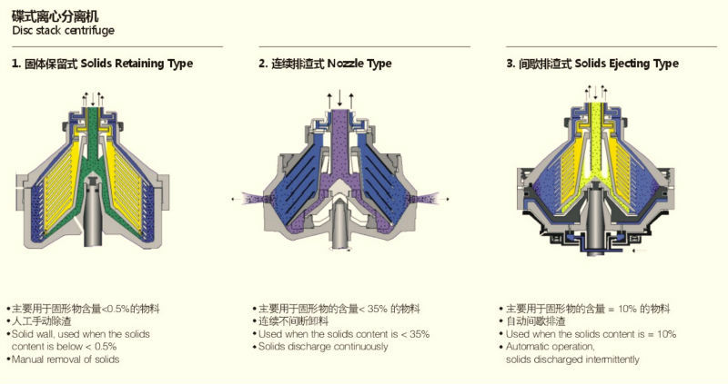 Usually, self-cleaning separator is divided into two types. One is used for solids and two liquid phases from each other in one single continuous process, it is so called purifier. The other is used for solids and one liquid phase from each other, it is so called clarifier.