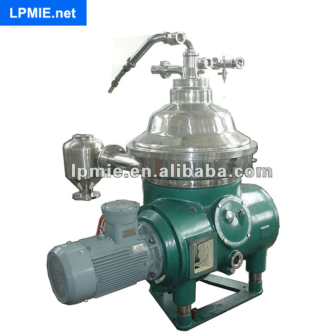 The bowl rotates at a high speed round the main axis, driven by a motor through hydraulic coupling and screw gear pair. Stock liquid flows from the upper feeding pipe into the bowl's bottom and then will be separated through holes of disc seat. by the action of centrifugal force field, heavy liquid flows along the inner wall of discs to the inner wall of the bowl, after up flowing along them, it will be discharged by the heavy liquid pump, the light liquid will be done by the light liquid pump, which flows along the inner wall of discs into centre pipe and then up to high liquid outlet. the larger solid phase particles left will sedimentation on the bowl's wall and then will be discharged, controlled by the sliding bowl, out of the sediment outlet.