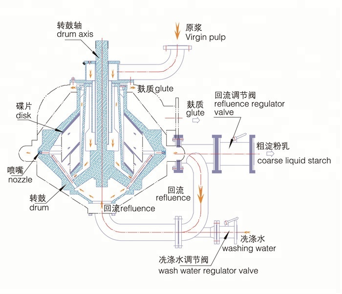 At the step of starch separating and washing , it's used for separating, concentrating, and washing the starch( (heavy phase) and albumen( light phase), and also can be used for separating, concentrating, and washing in the industries of pharmaceutical, chemical, foodstuff.
