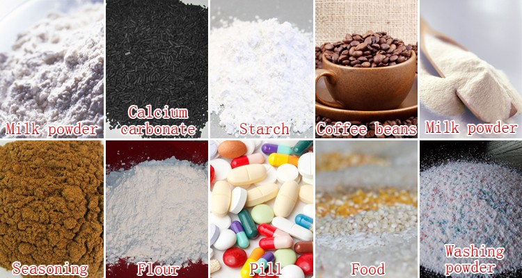 Food industry: powdered sugar, starch, salt, rice flour, milk powder, milk, egg, soy sauce, fruit juice.
