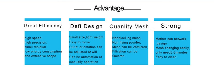 High screening efficiency, the screen mesh can be made full use of. It can be equiped with screen cloth cleaning device, which can effectively avoid clogging. Small volume, move easily. It adopts whole sealing structure design. Convenience of installation and service. Horizontal distance between inlet port and outlet port is small, which make the arrangement of machines easier. Direction of outlet port can be changed within 360 degrees.
