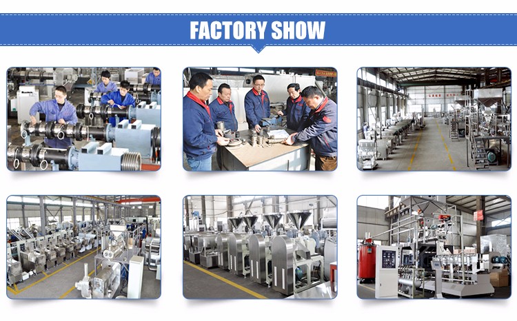Our factory has over 22 years experience of the industry development. We have well-experienced managers,outstanding engineers as well as well-trained technical workers. By constant technical exchange with well known firms of the same line in the world and also by introduction of advanced techniques and experiences into our company,we have established a strong technical guarantee system.According to the clients' different requirements, we could offer the whole complete processing line for all kinds of expanded snacks, corn flakes, nutrition powder, and pet food and so on. Our technical assistance will help clients produce high quality products all the time. Depending on our rich experience and professional experts on the extruded food industry, we could offer the most suitable and complete program to assure that your investment will get biggest profit.