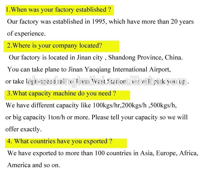 2. Capacity: 100kgs/H ,260kg/h, 600kg/h, 1200kgs/h