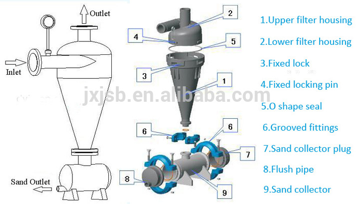 A typical hydrocyclone separator of this series is consists filter housing, fixed lock, pin, seal, plug pipe, sand collector as the picture show
