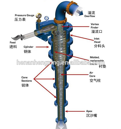 The working principle of hydrocyclone is centrifugal sedimentation, when two phases (or three phases) mixed liquid is fed into hydrocyclone by a certain pressure liquid and produces strong three-dimensional-elliptic rotational movement. Due to the different density of particles, the centrifugal force, the centripetal buoyancy and drag force is different. So most coarse particles (or heavy phase) are discharged from cyclone underflow outlet, and the fine particles (or light phase) from the overflow tube, so as to achieve separation.