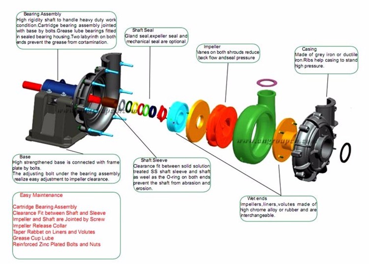 The heavy and robust slurry pump and perfect used perfect impeller structure ensure satisfactory performance with long life and needs minimum maintenance requirements.