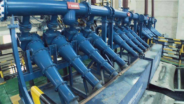 Slurry is fed to cyclones through inlet in tangential or involute direction (depending on feeding way of the inlet head). Under centrifugal force, large particles will move downwards along outer swirling flow and be discharged through apex as underflow while fine particles will move upwards through inner swirling flow and be discharged from apex finder as overflow.