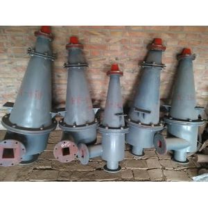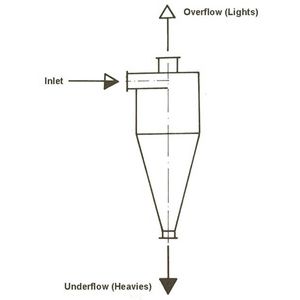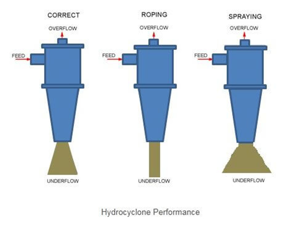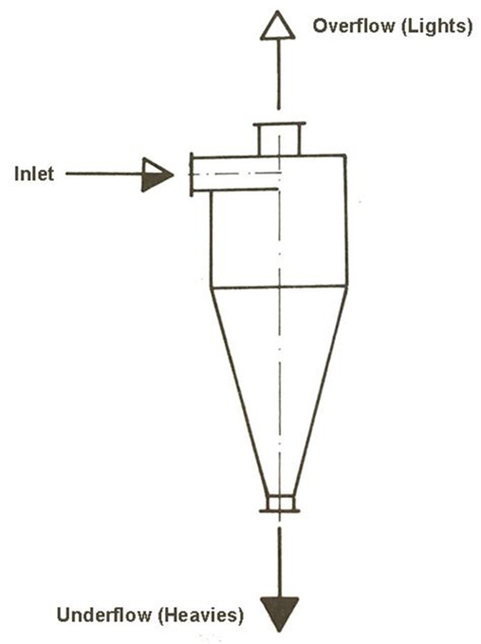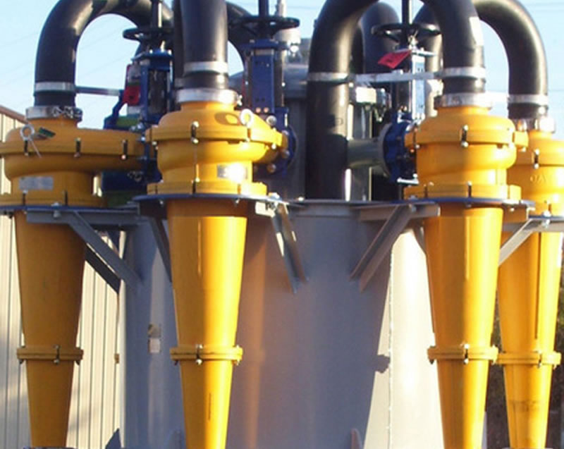 Hydrocyclone is a separation equipment with high efficiency which utilizes centrifugal field to separate two-phase fluid, and it has been applied in classification, thickening, dewatering, desliming, separation, washing and other processes. Slurry is fed to cyclones through inlet in tangential or involute direction (depending on feeding way of the inlet head). Under centrifugal force, large particles will move downwards along outer swirling flow and be discharged through apex as underflow while fine particles will move upwards through inner swirling flow and be discharged from apex finder as overflow.