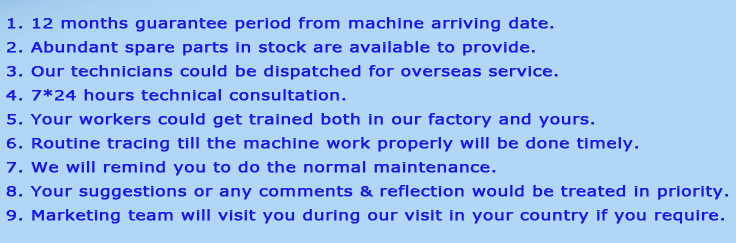 We have some partnership in several countries as Indonesia, Brazil, USA, etc. Your are warmly welcomed to work as our agent. At this moment, we have no service center abroad, but we can provide overseas spot and online technical service in time.