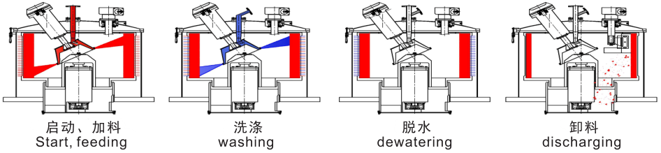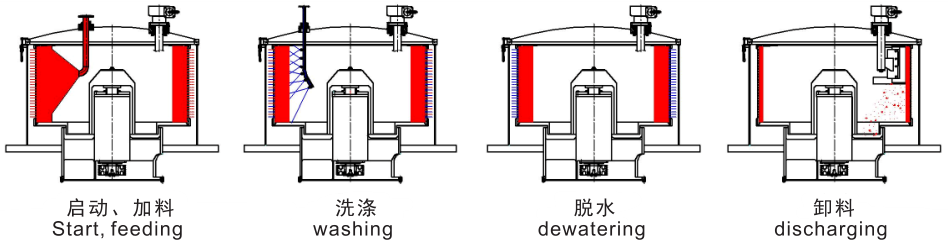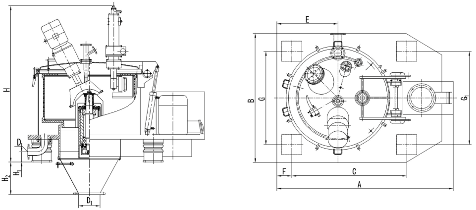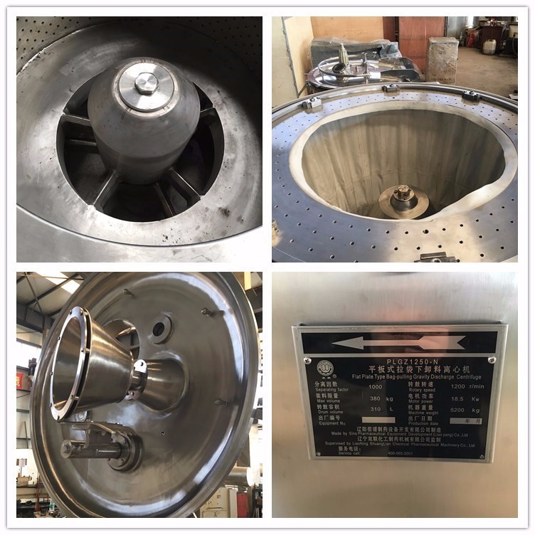 According to GMP standard and environmental protection sanitary requirement, PGZ plate type centrifuge is designed based on the traditional 3-feet bottom discharging centrifuge, and is a new bottom discharging centrifuge, in which the traditional suspending legs are cancelled, and the flat balancing weight and high-viscosity damp vibration isolator is equipped, and there is no foundation’s installation. Frequency convertor controls the motor, which drives the belt wheel to transfer the power to the bowl through the triangle belt, and keep the bowl rotating around itself axis by high speed to form centrifugal force field. Material from the top feeing pipe is forced to have the separation on the bowl wall evenly by the centrifugal force. Through the solid phase, the filter screen gap and the holes in the bowl, the liquid phase is splashed into the shell space, and then be discharged from the outlet at the bottom, while the solid phase will be remained in the bowl. After the dewatering, the bowl speed is reduced, and the solid material will be taken away by the scraper, and be discharged through the bowl’s bottom outlet.