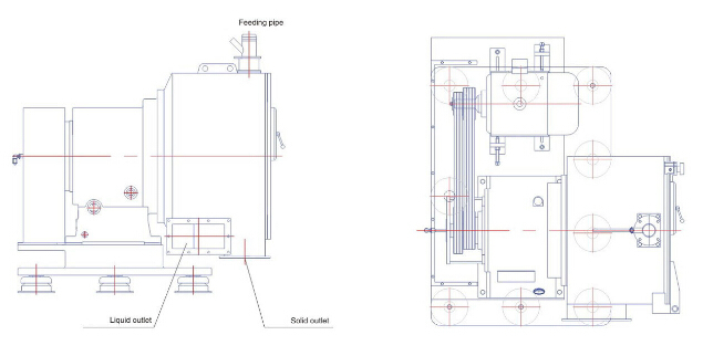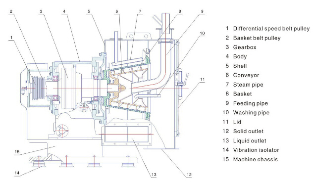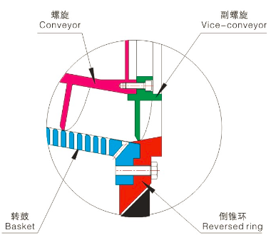 The feed suspension is introduced to the centrifuge through a feed pipe and into the feed distribution chamber, and is jetted into the basket through the hole near the cone point of the conveyor. Under centrifugal force the solids filtrate from the liquid and settle against the basket wall, while the clarified liquid exits over the overflow screen. The solids in the conical basket are conveyed up from the smaller end to the bigger end while the conveyor turns at a slightly different speed. The bigger diameter is, the bigger centrifuge force produces to separate the liquid/solids. The solids are dried when they are drained out the basket.