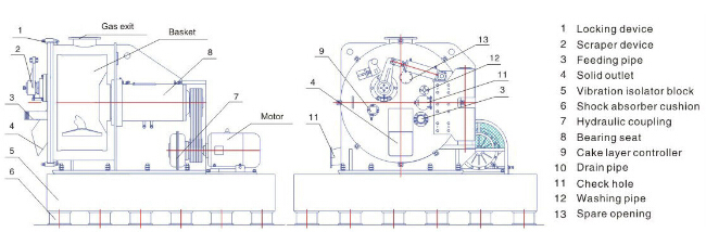 When the drum driven the motor runs at full speed, the feed valve automatically opens up and the suspension liquid goes through the feed pipe into the drum, where the liquid phase passes through the filter gauze and the screen openings on the drum and is kicked off by the centrifugal force and flows out of the tangential discharging outlet, while the solid phase is retained inside the drum. When the set time is reached, the feeding stops. After a given period of time of separation and dehydration, the washing valve acts and the cleaning liquid passes through the washing pipe into the drum to wash the filter cake. Upon the completion of washing, further separation is conducted till the required degree of dryness of the cake is reached. Then discharging starts: the scraper holder rotates enabling the scraper to cut into the cake layer and the cake is scraped off and discharged from the material hopper.