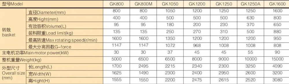 Model GK centrifuge is the filter equipment characterized with continuous running, scraper discharging and intermittent operation, applicable to the separation of the suspension liquid containing medium-sized granules or fine granules (0.01mm~5mm). It can also be used for the separating of the suspension liquid containing short fibers (with the fiber length less than 4mm), with the concentration of the suspension liquid being 10%~60%. With hydraulic and electric joint control mode adopted, this series of centrifuges are capable of high degree of automization, with such working processes as feeding, dehydrating, washing, discharging, etc. being operated manually or by means of PLC for full automatic control. The horizontal scraper discharging centrifuge has good adaptability to the material to be processed and thus can be widely used in such industrial fields as chemical, light industry, food, pharmacy, etc. for the separating of over 100 kinds of substances including ammonia sulphate, sodium sulphate, anthracene, boric acid, starch, pesticide, synthetic resin, sodium cyanide, potassium chloride, sodium bicarbonate, etc.