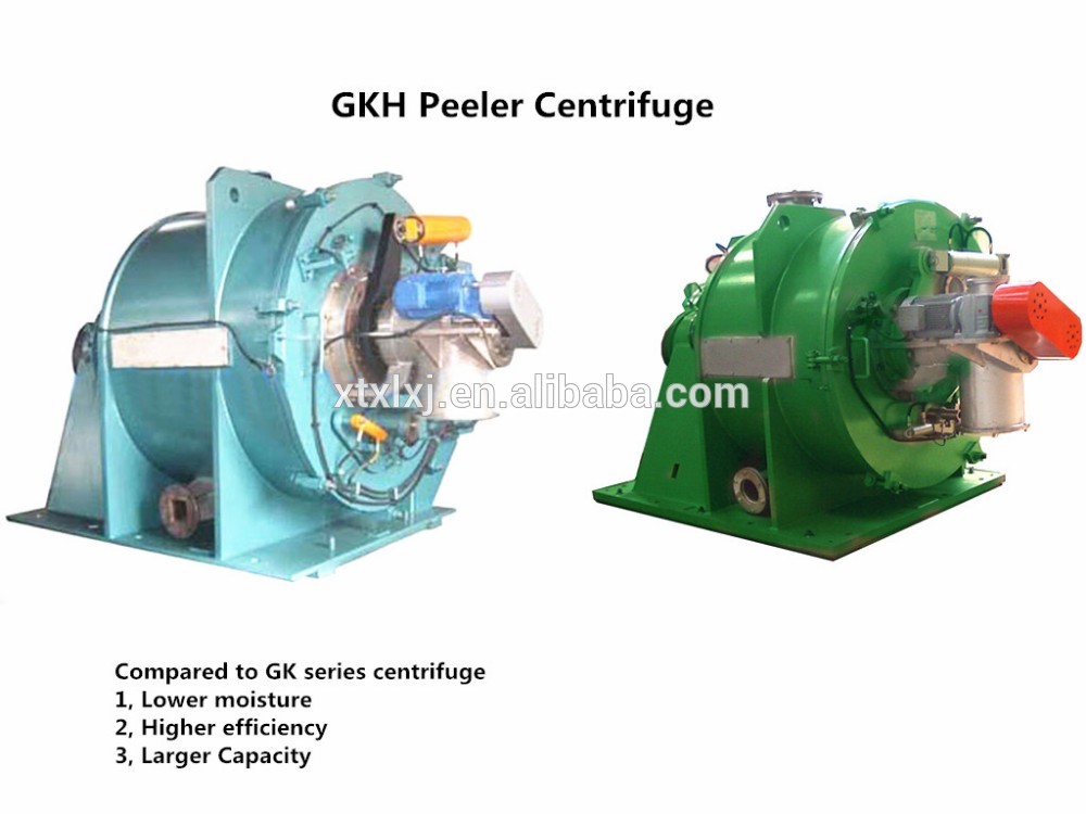 GKH series is kind of horizontal peeler/scraper discharge and siphon filtering centrifuge with full automatic control and continuous cycling operation. It can accomplish the whole processing of feeding, separating ,washing ,dehydrating and washing the mesh at full speed