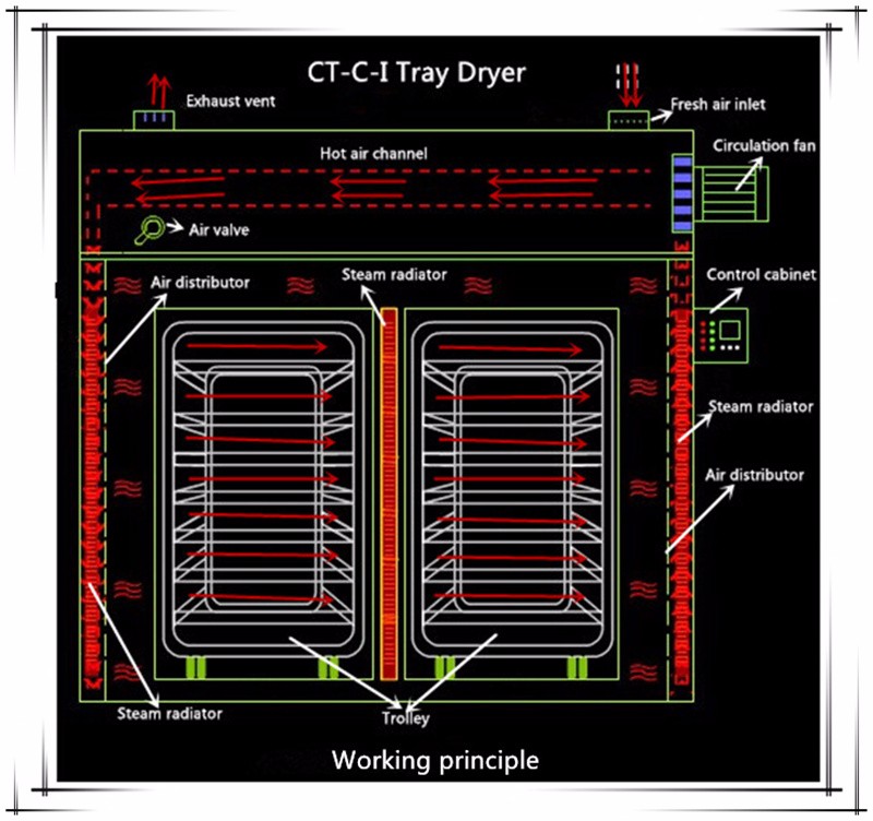 In drying process, the fresh cold air is sucked into the drying chamber by the circulation fan and flow through the inner placed steam radiator (or electrical heating tubes) in the air channel to get required temperature. With the help of air distributor, the hot air evenly flow through each layer of trays for heat transfer and carry away the evaporated moisture. Most of the damp air flows back to the circulation fan for the next drying circulation while part of the damp air will be exhausted for energy saving.
