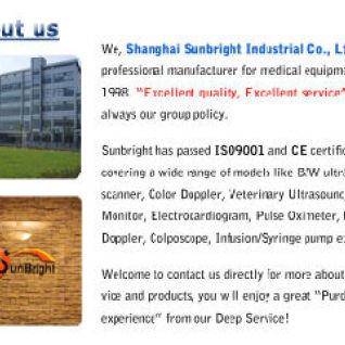 Shanghai Sunbright has several dozes of series of products which combine optical, mechanical, electrical and computer technology, including color dopplers, B ultrasounds, multi-parameter monitors, colposcopes, electrocardiograms and so on. With high quality products and services, Shanghai Sunbright got high trusts from most of customers and the attentions and supports from leaders at all levels. Currently Sunbright has become the famous and leading brand in the line, has set up more than 50 branch offices and after service offices in more than 20 provinces, municipalities and autonomous region in China, exported products to more than 50 countries in Europe, Asia, Africa, South America and North America and become the unique platform of Sunbright for sale and service.
